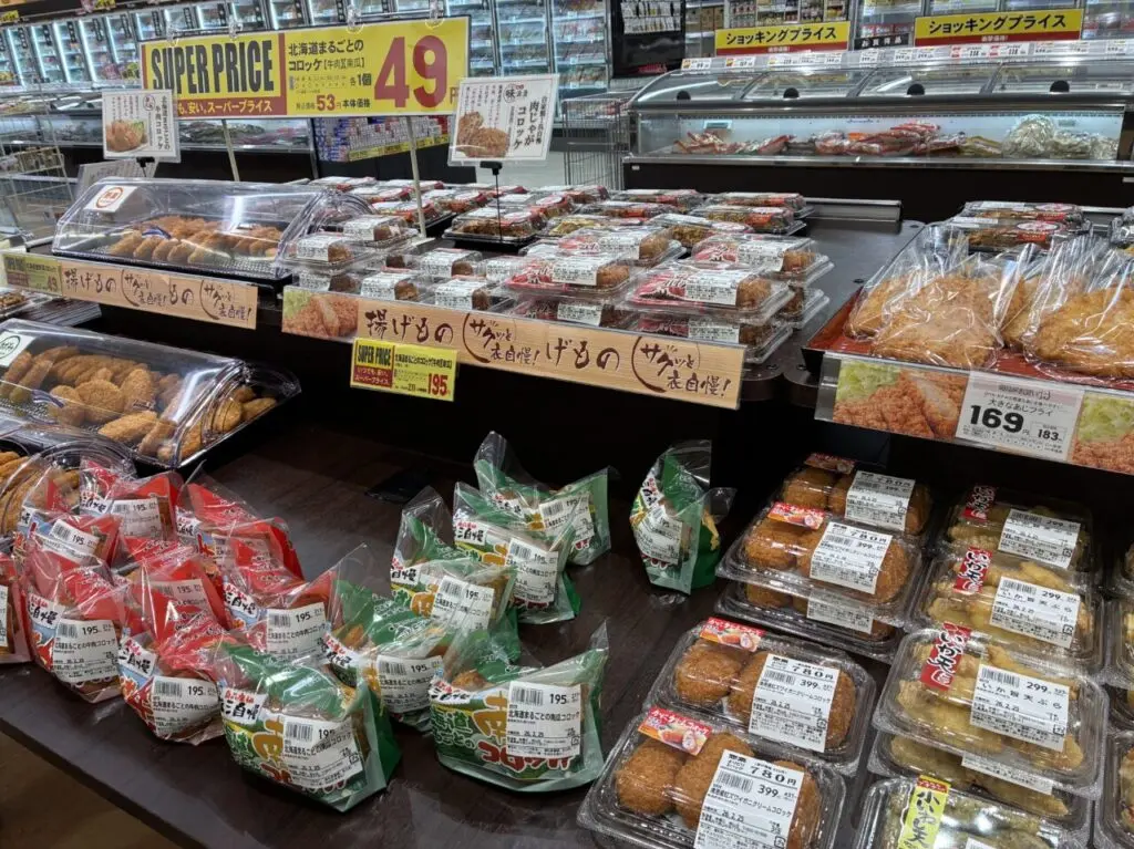 冷蔵ケースの向かいには冷凍ケースがあります。中には冷凍の肉、ぎょうざ、ハンバーグ、お惣菜などが並んでいます。