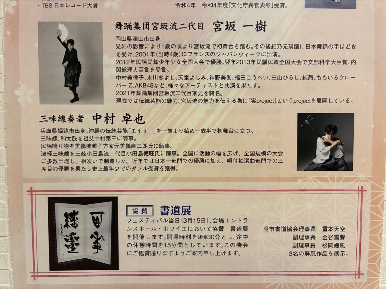 邦楽総合フェスティバル当日(2026年3月15日)、会場エントランスホール・ホワイエで協賛 書道展が開催されます。